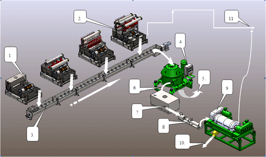 該系統(tǒng)的主要模塊有:GN系列鉆屑干燥機(jī)、GN系列高G鉆井液振動(dòng)篩、GN系列高速變頻鉆井液離心機(jī)、螺旋輸送器等。